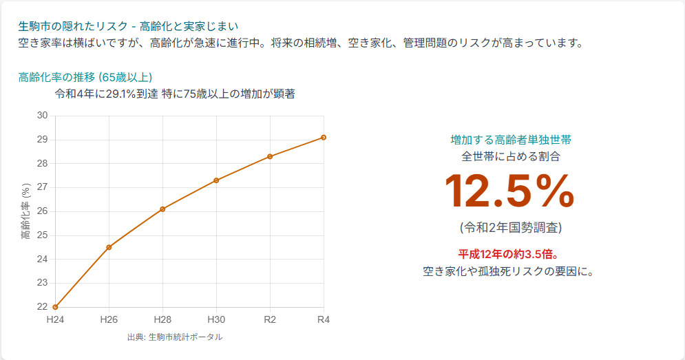生駒市では、65歳以上の高齢者人口、特に75歳以上の方が年々増加しているという、別の大きな課題があります 。令和4年には高齢化率が29.1%に達しています。