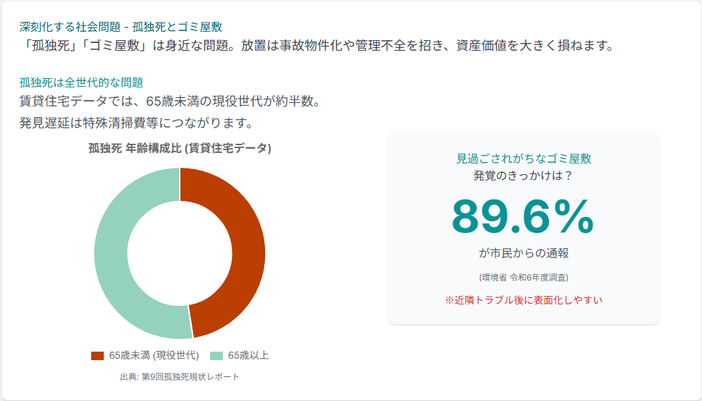 発見が遅れると特殊清掃や原状回復が必要となり、その物件は事故物件(心理的瑕疵物件)となってしまいます。 - 近隣トラブルに直結するゴミ屋敷:セルフネグレクト等により家が「ゴミ屋敷」化するケースも社会問題化しています。