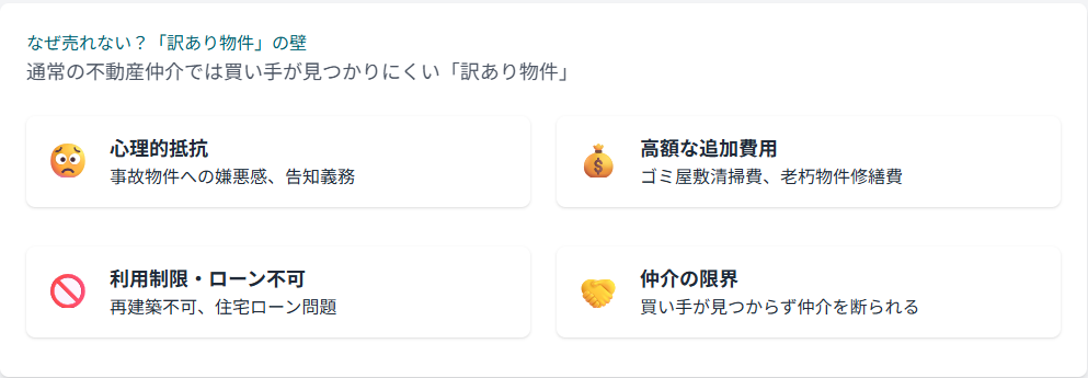 これらの理由から、「訳あり物件」は一般的な不動産市場での売却(仲介)が非常に困難になるのです。