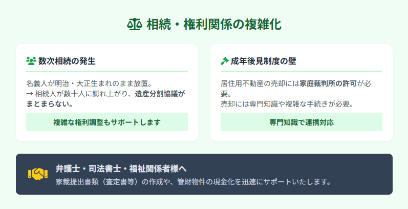 - 相続登記未了、共有名義で揉めている物件、借地権・底地権