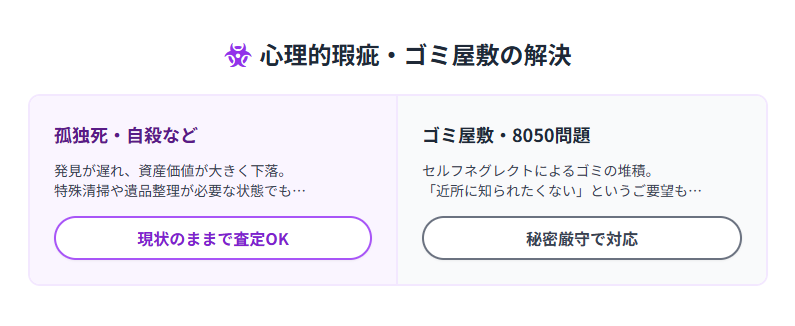 私たちは、一般的な不動産会社が敬遠しがちな、いわゆる「事故物件」や管理不全な状態の物件も積極的に取り扱っています。