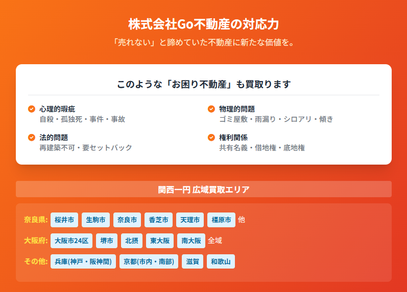 株式会社Go不動産では、一般的な不動産売却はもちろん、他社では断られがちな「訳あり物件」や「権利関係が複雑な物件」の買取りに力を入れています。