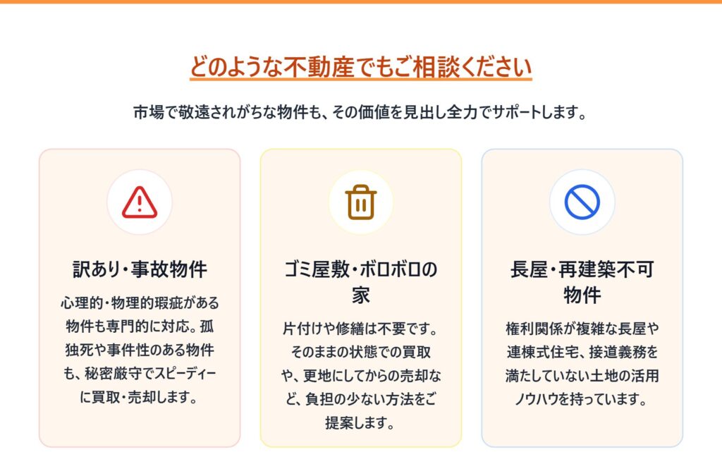 - その他特殊な事情を抱える物件:借地権・底地権、増築未登記の物件、長屋・連棟式住宅、文化住宅、狭小住宅