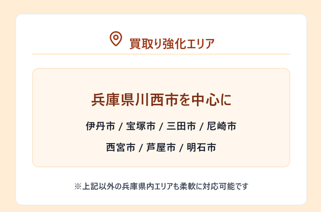 兵庫県川西市を中心に、伊丹市、宝塚市、三田市、尼崎市、西宮市、芦屋市、明石市にて積極的に買取・売却サポートを行っております。