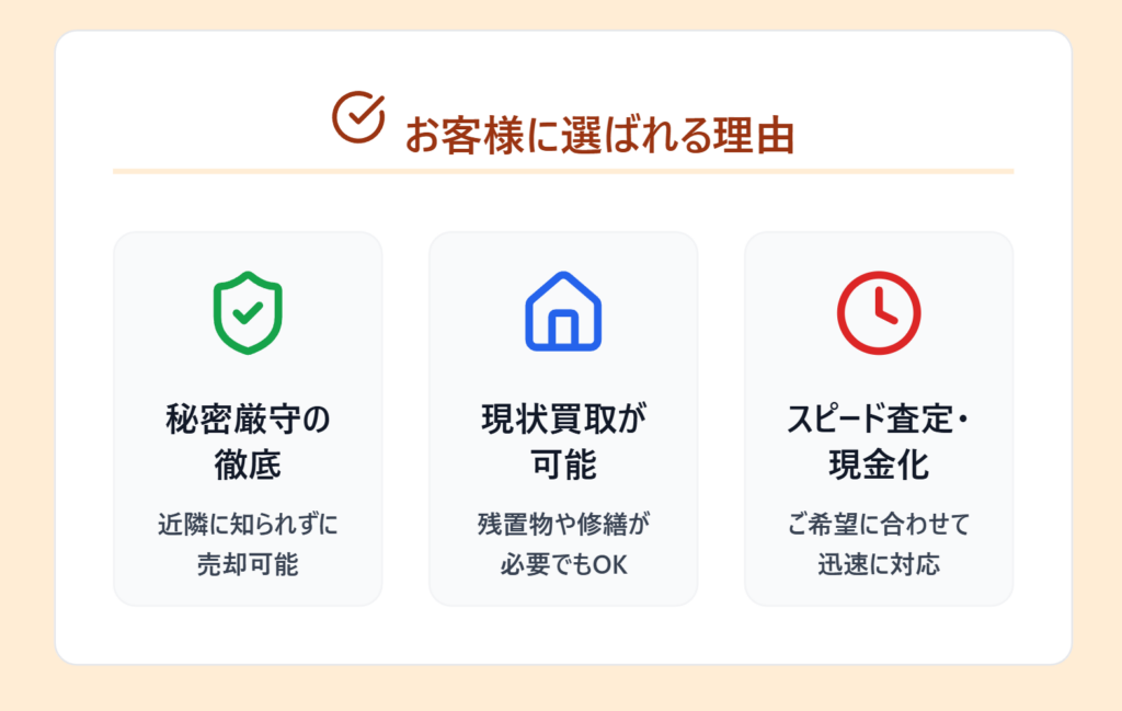 - 秘密厳守の徹底:近隣の方に知られずに売却を進めたいというご要望にも、徹底した配慮で対応いたします。