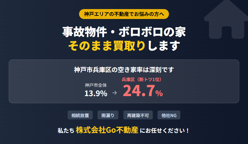 特に、空き家率の高い兵庫区や、古い街並みが残る長田区・須磨区などでの「相続物件」や「実家買取り」のご相談をお待ちしております。