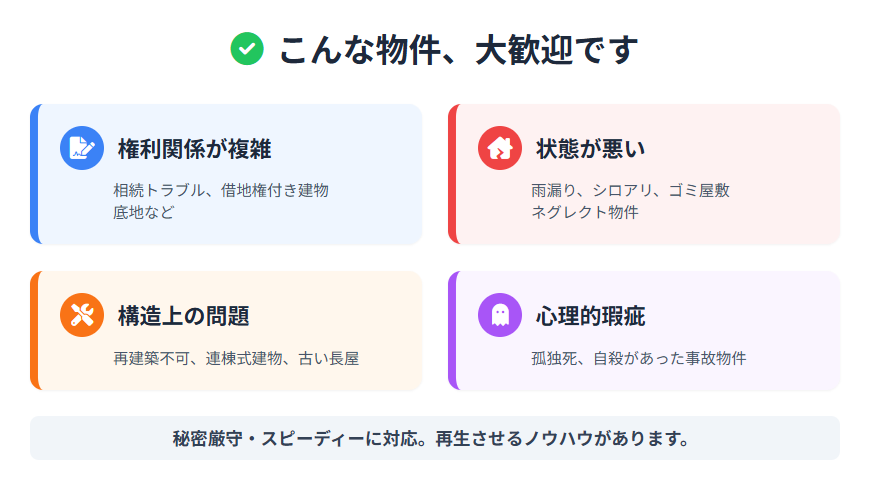 また、近年増加している「孤独死物件」や「ネグレクト物件」などの事故物件・難あり物件・訳あり物件についても、秘密厳守でスピーディーに対応可能です。