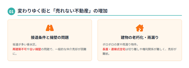 また、神戸市の下町エリアに多く見られる長屋や連棟式住宅(テラスハウス)は、隣家と壁を共有しているため、切り離し解体の難しさや権利関係の複雑さから、売却活動が難航する代表的な物件種別となっています。