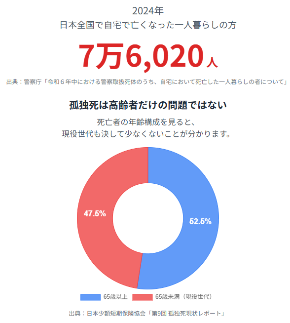 特に高齢者の単身世帯は年々増加しており 、それは誰にも看取られることなく自宅で亡くなる「孤独死」のリスクが、私たちのすぐ身近に存在することを意味します。