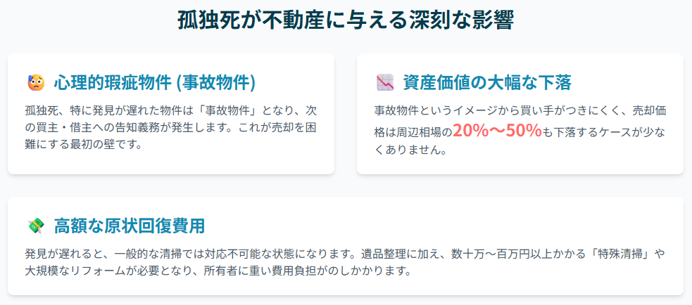 孤独死があった物件は、周辺相場と比較して10%~20%、場合によってはそれ以上に売却価格が下落する可能性があります 。