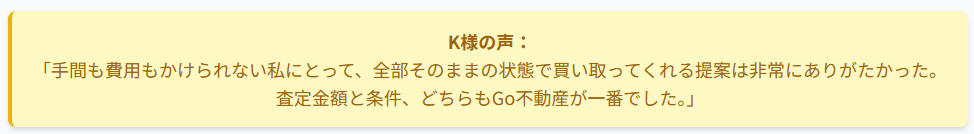 「訪問から1週間ほど考えましたが、Go不動産さんにお願いしたいです。全部そのままの状態で買い取っていただけるというのは、手間も費用もかけられない私にとって、本当に、本当にありがたい提案でした。査定金額と条件、どちらもGo不動産さんが一番良かったです。」