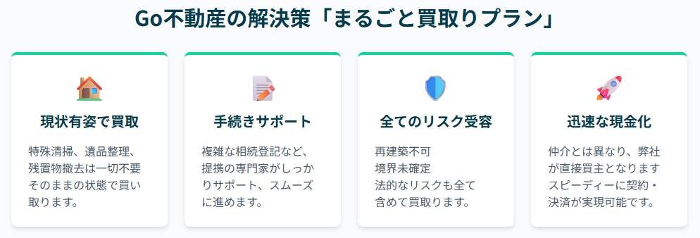 - 現状有姿での買取り: 特殊清掃、遺品整理、残置物撤去を一切行わず、現在の状態のままで買い取ります