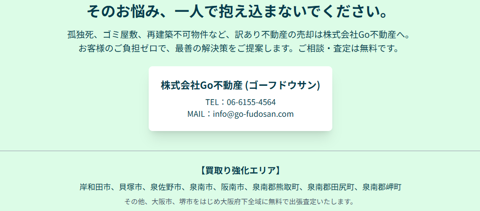 株式会社Go不動産は、孤独死、自殺、ゴミ屋敷、再建築不可物件など、一般の不動産会社では取り扱いが難しい不動産を専門に、現状有姿で買取り、再生する事業を行っております。