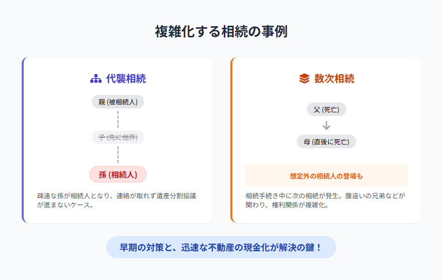 話し合いが先送りされ、時間が経過すると、相続人の構成が変わり、権利関係が極めて複雑になることがあります。以下のパターンは、空き家放置のリスクを高める典型的な要因です。