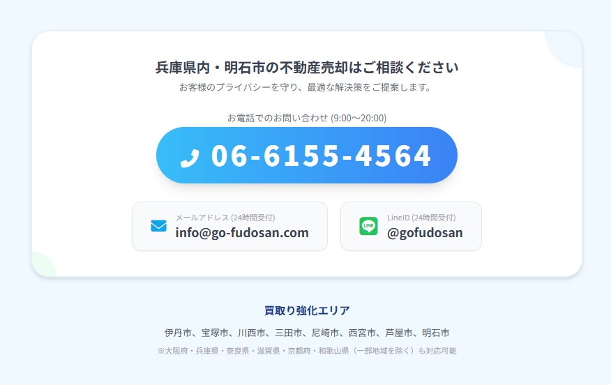 明石市をはじめ、兵庫県内の広いエリアで活動しており、地域の市場動向を熟知した査定を行います。