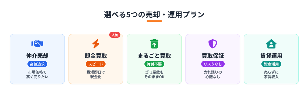 単に物件を売りに出すだけでなく、直接の買取りや、荷物が残ったままでの売却など、手間をかけずに現金化する方法も充実しています。