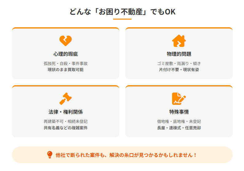 株式会社Go不動産では、一般的な不動産会社が敬遠しがちな、いわゆる「訳あり物件」や「お困り不動産」の買取りに力を入れています。