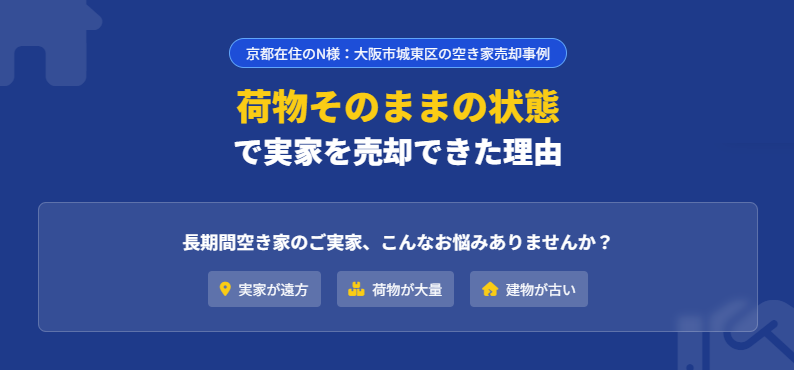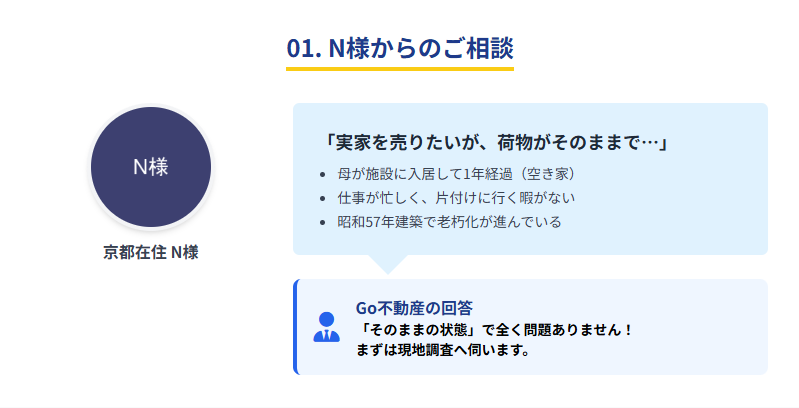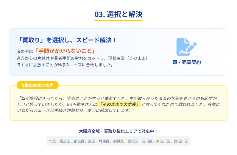 遠方の京都から何度も大阪に通って片付けをする労力や業者手配の手間、そして売れるかどうかわからない不安を抱え続けるよりも、現状有姿(そのままの状態)ですぐに手放せる点が、N様のニーズに合致しました。