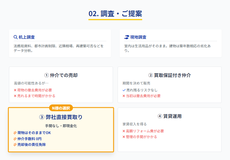 ご提案(仲介での売却・買取りでの売却・自己所有賃貸運用など)