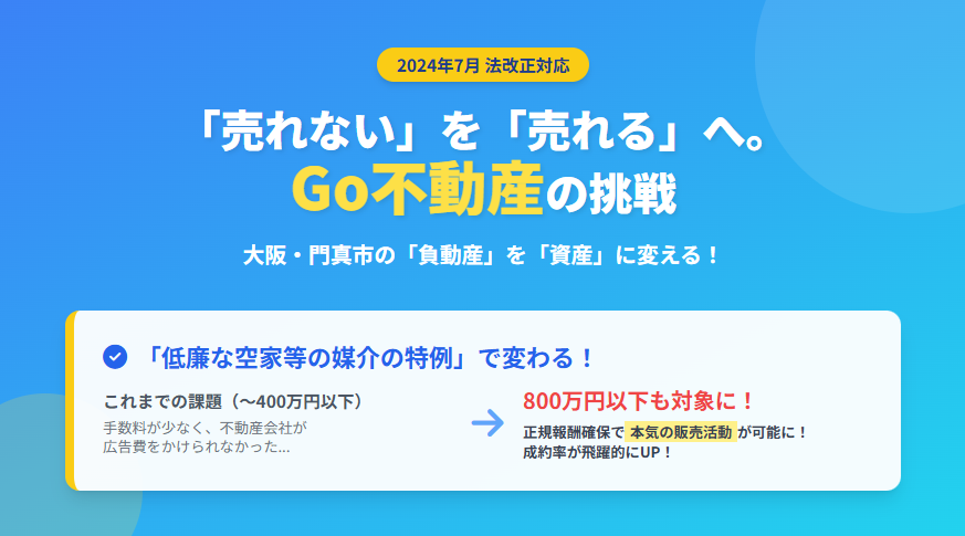 株式会社Go不動産は、この法改正をチャンスと捉え、これまで市場で取り残されてきた空き家や長屋、再建築不可物件などに新たな価値を見出し、流動化させることに全力を注いでいます。