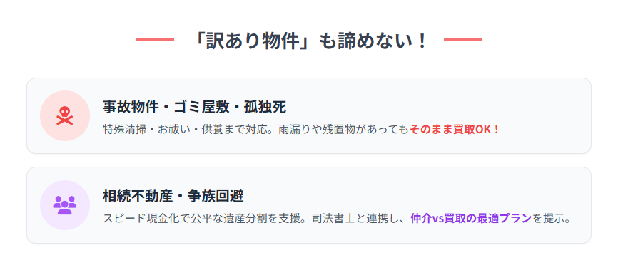 - 物理的な問題を抱える物件:ゴミ屋敷、雨漏り、シロアリ被害、傾きがある物件
