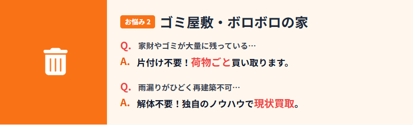 いわゆるゴミ屋敷と呼ばれる状態や、大量の荷物が残っている物件でも、弊社では現状のままで買取が可能です。