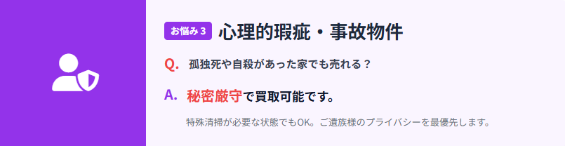 A:はい、事故物件や特殊清掃が必要な物件も、秘密厳守で買取可能です。