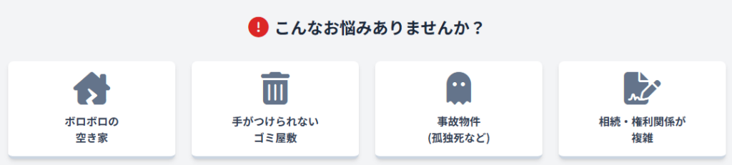 私たちは、お客様が抱える「こんな状態では売れないかもしれない」という不安を解消するために、以下の物件の買取りに力を入れています。