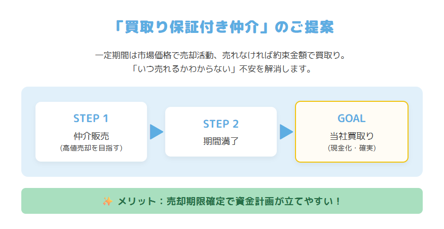 「売れなかったらどうしよう…」と不安に思われる方に対して、弊社が推奨している売却方法の一つが「買取り保証付き仲介」です。