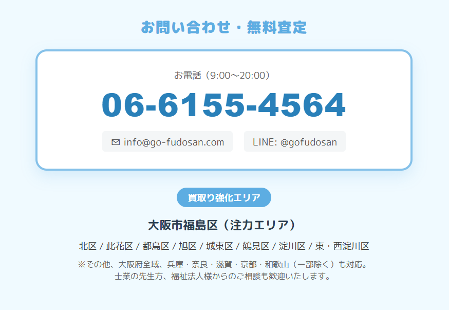 株式会社Go不動産では、大阪・兵庫・奈良などの関西エリア全域をカバーしておりますが、特に大阪市内の以下のエリアでの買取り・売却活動を強化しています。
