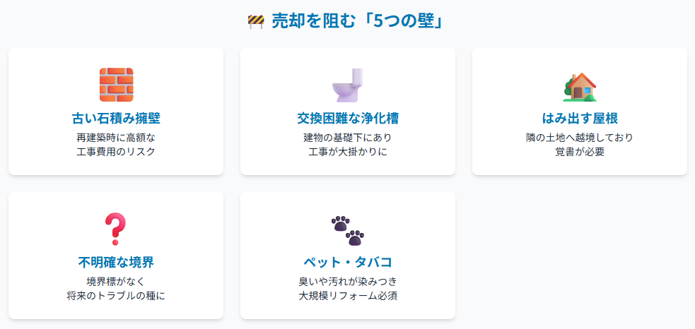 建物が古いだけでなく、現行の建築基準法に適合しない擁壁、隣地との境界問題、長年の暮らしで生じた室内の損傷など、専門知識なしでは解決が難しい「訳あり物件」となっているケースが少なくありません。