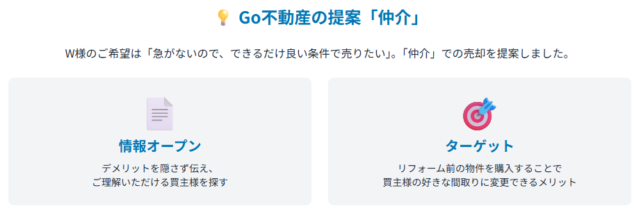 W様が「売却を急いでおらず、できるだけ良い条件で手放したい」とご希望されていることを踏まえ、株式会社Go不動産は「仲介」での売却をご提案しました。