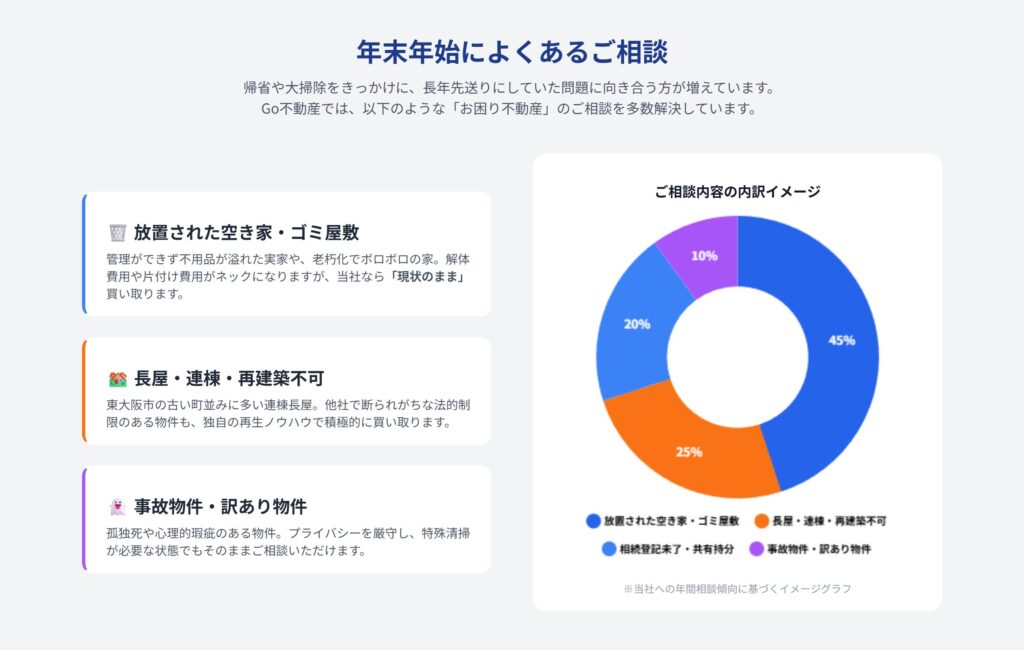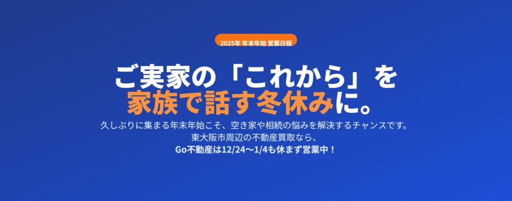 今回は、当社の会社紹介を兼ねまして、2025年12月から2026年1月にかけての年末年始の営業スケジュールのご案内と、この時期にご家族が集まるからこそ話し合っておきたい不動産の課題、そして現在買取りを強化している東大阪市エリアについてお伝えいたします。