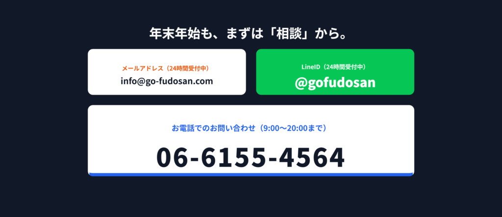 多くの不動産会社が年末年始の休業期間に入る中、株式会社Go不動産は、ご親族が集まる大切なタイミングだからこそ生まれる疑問や不安に即座に対応するため、下記の期間も休まず営業いたします。