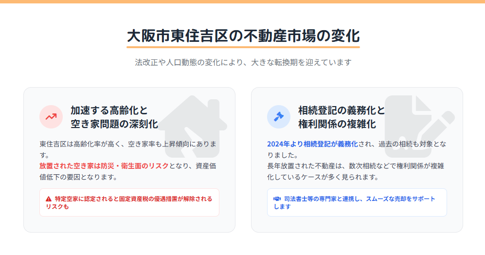 特に、歴史ある住宅地が広がる大阪市東住吉区においては、建物の老朽化や所有者の高齢化に伴い、空き家や相続に関するご相談が急増しています。
