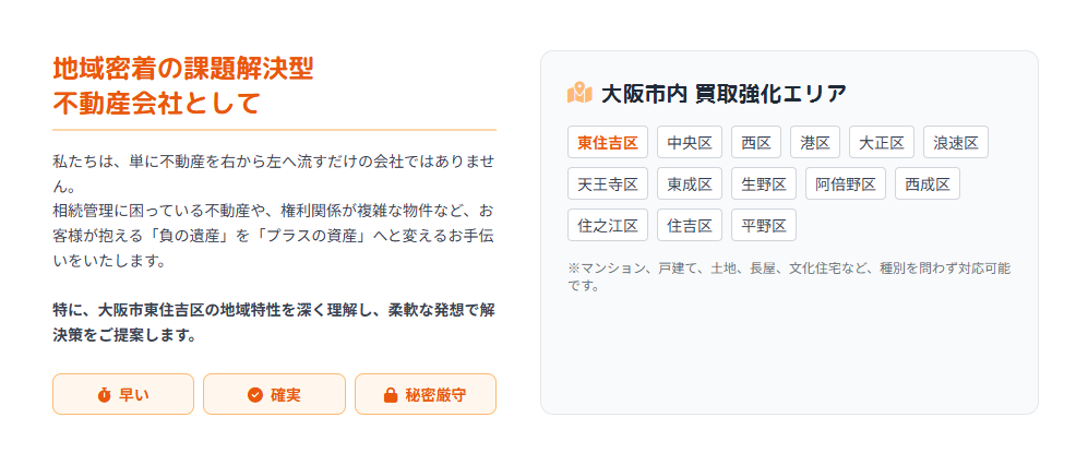 特に、大阪市東住吉区の地域特性を深く理解し、このエリア特有の長屋文化や密集市街地の課題に対して、柔軟な発想で解決策をご提案します。