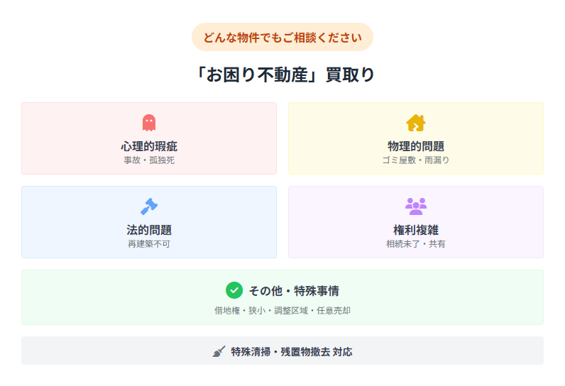 - その他特殊な事情を抱える物件:借地権・底地権、増築未登記の物件、長屋・連棟式住宅、文化住宅、狭小住宅