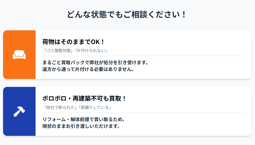 他社で断られた「古い家」「再建築不可」も現状のまま買取り