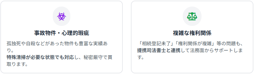 • その他特殊な事情を抱える物件:借地権・底地権、増築未登記の物件、長屋・連棟式住宅、文化住宅、狭小住宅