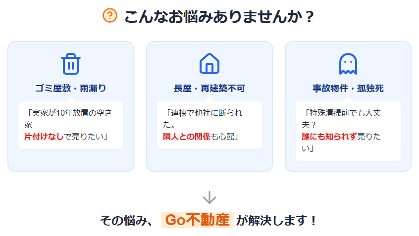 もし、他社で断られたり、ご近所に知られずに解決したいとお考えなら、ぜひ私たち株式会社Go不動産にお任せください。当社は、一般的な売却だけでなく、こうした「ワケあり物件」の「直接買取」に特化した独自のノウハウを持っています。
