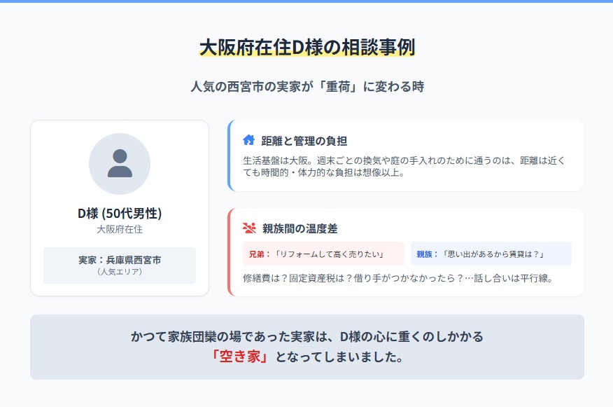 大阪府在住D様の相談事例:人気の西宮市の実家が「重荷」に変わる時