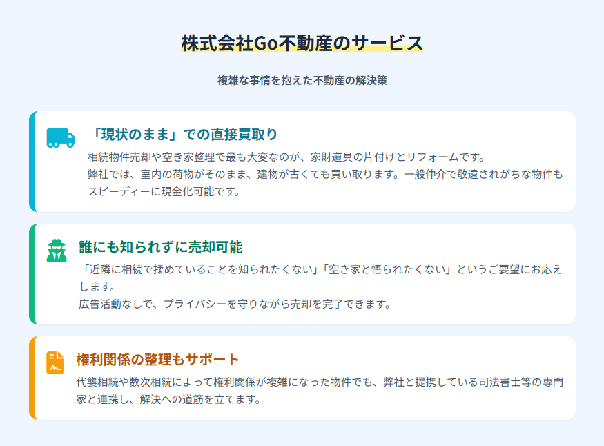 私たち株式会社Go不動産は、こうした相続や空き家の問題に特化したサービスを提供しています。