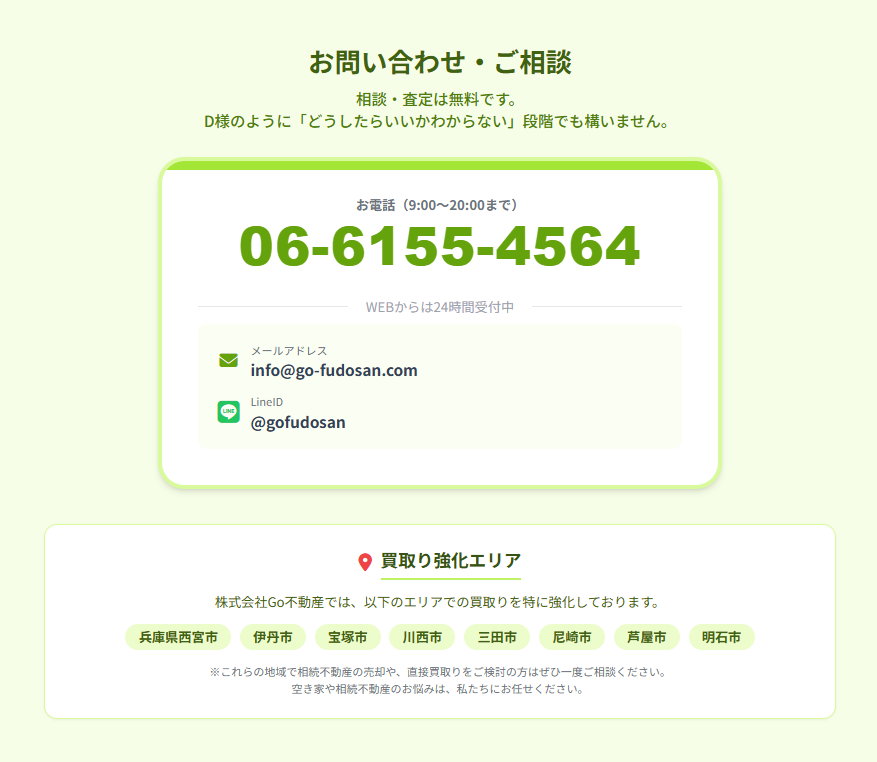 これらの地域で相続不動産の売却や、直接買取りをご検討の方は、ぜひ一度ご相談ください。