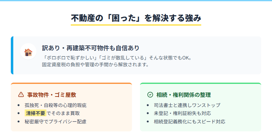 弊社は、一般的な仲介売却だけでなく、他社で断られがちな「訳あり物件」や「再建築不可物件」の取り扱いに自信を持っています。