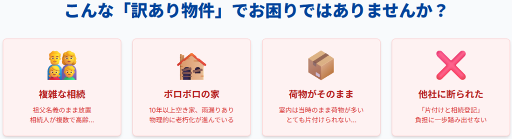 「まるごと買取パック」は、K様のような複雑な相続問題や空き家以外にも、一般的な不動産会社が敬遠しがちなお悩みにも対応します。