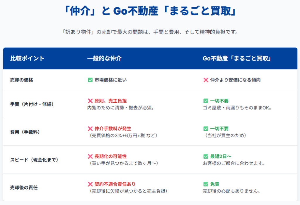 このサービスは、私たち株式会社Go不動産がお客様から直接、物件を買い取るため、K様が直面したような「売却前の負担」をすべて解消できます。