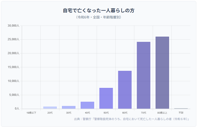 警察庁の発表によると、令和6年中に自宅で死亡した一人暮らしの方は全国で76,020人にものぼります。