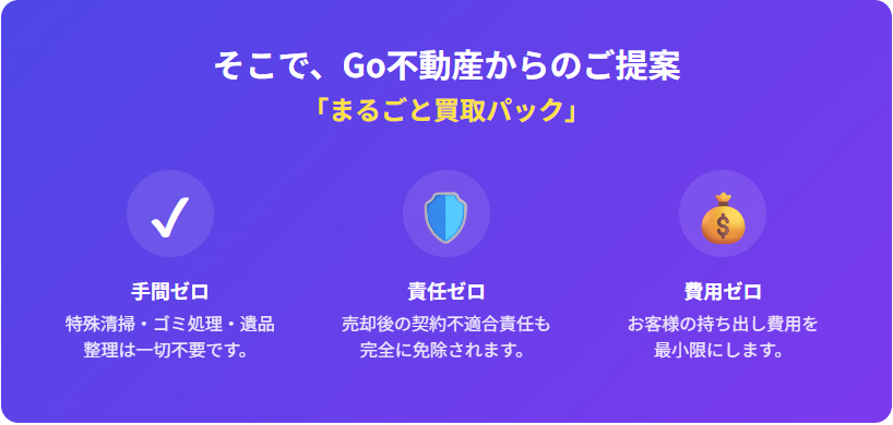 - 売却後の責任も一切不要です。(売主が負う「契約不適合責任」は、弊社が買主となるため免除されます)