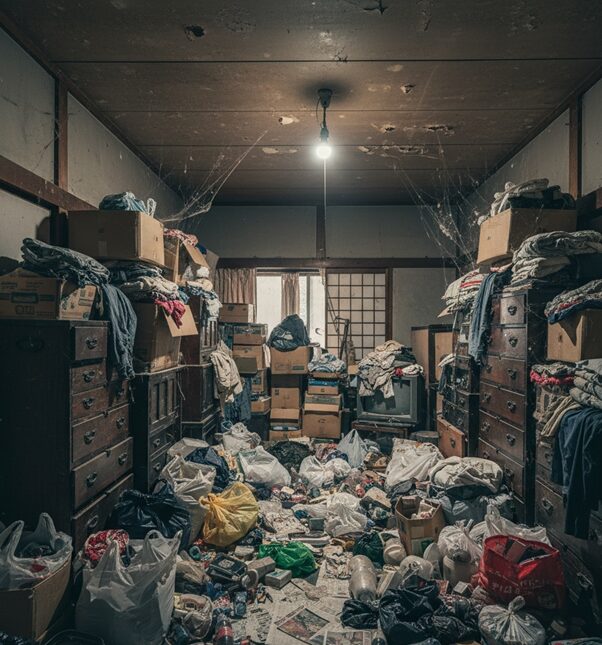 - 室内(物量): 玄関を開けると、物がごった返しており、特に2階は完全に物置状態で、足の踏み場がないほどの荷物が天井近くまで積み上がっていました。