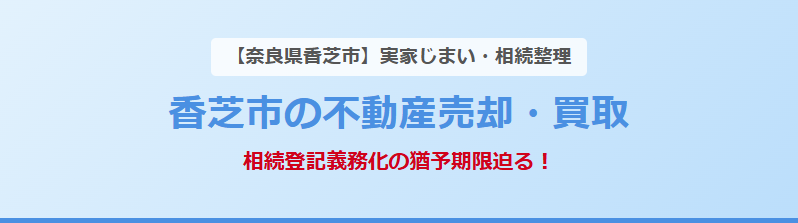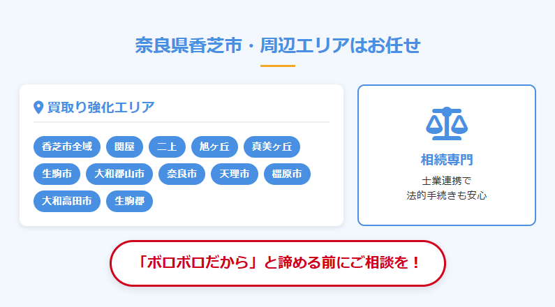 現在、奈良県香芝市(全域:特に関屋、二上、旭ヶ丘、真美ヶ丘周辺など)をはじめ、生駒市、大和郡山市、奈良市、天理市、橿原市、大和高田市、そして生駒郡(平群町、斑鳩町)での買取りを特に強化しています。